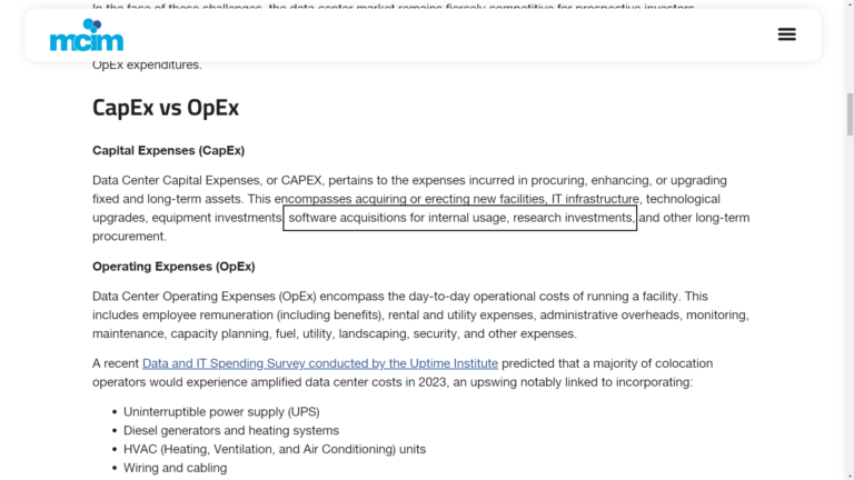 “According to a McKinsey survey and several other sources, the average server utilization rate in data centers is a mere 15%, while the reservation rate is 80%. This means that servers are consuming energy and incurring costs without carrying the workload they should be.”” Many studies also indicate that CAPEX efficiencies can be increased with “software acquisitions” related to equipment usage.
