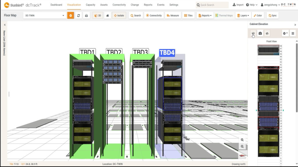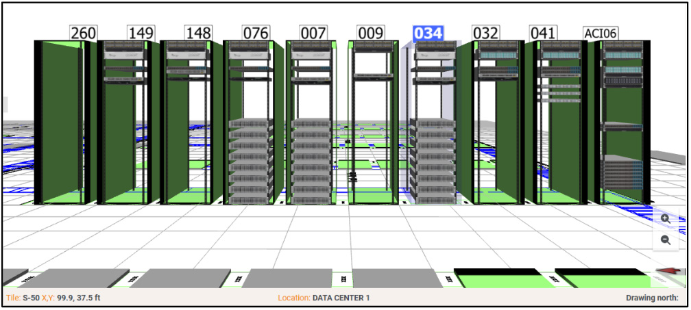 DC Twin provides a real “live” 3D view, dynamic zoom in / zoom out, to every area inside a data center, every equipment front / back view, cables, topologies….